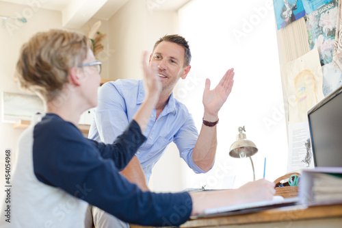 © KOTO, Obraz premium Father helping teenage son doing his homework in room