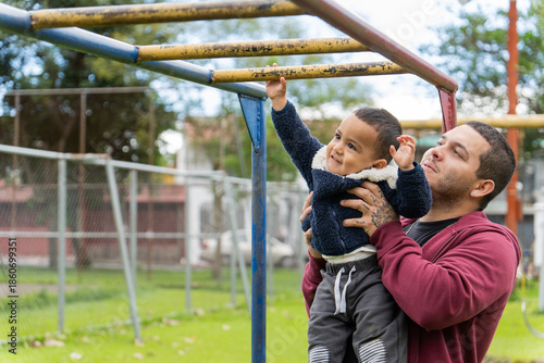 © Jordan, Obraz premium Father helping toddler playing on monkey bars