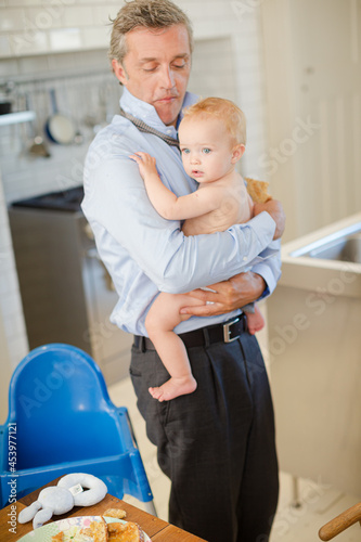 © KOTO, Obraz premium Father holding baby and eating breakfast