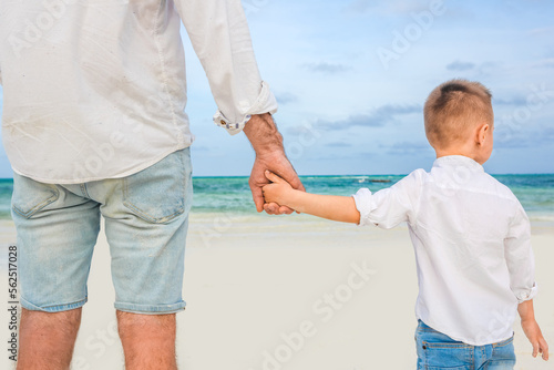 © olyphotostories, Fototapeta premium Father holding son's hand at the beach