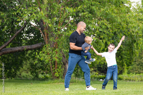 Fototapeta premium Father plays with little boy son, hug baby in the park on a warm summer day. Happy childhood concept. Happiness and harmony of family life. Great family vacation.