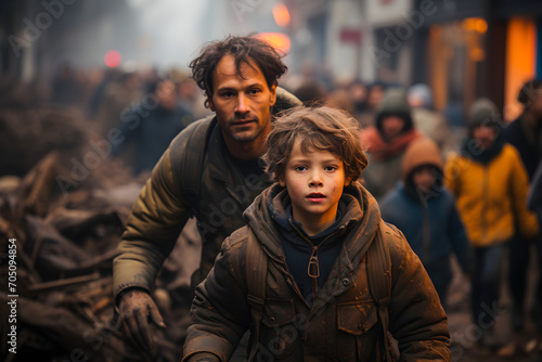 Fototapeta premium Father running while trying to evacuate from city war zone with little son