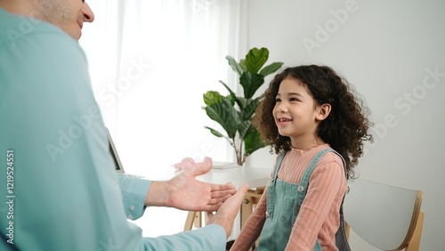 © InfiniteFlow, Obraz premium Father talking to daughter and explain about generate ai while laptop screen show engineering prompts or coding program. Happy dad checking schoolgirl understanding about writing program. Pedagogy.