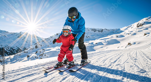 © Milan, Naklejka premium Father teaching little child to ski on snowy mountain slope. Dad helping toddler on skis during winter vacation. Family ski holiday concept