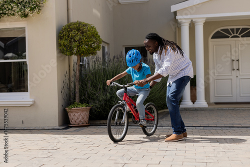 Obraz premium Father teaching son to ride bicycle in front of house, both smiling