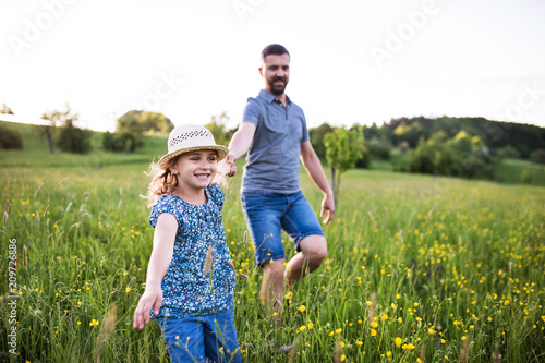 © Halfpoint, Fototapeta premium Father with a small daughter running in spring nature.
