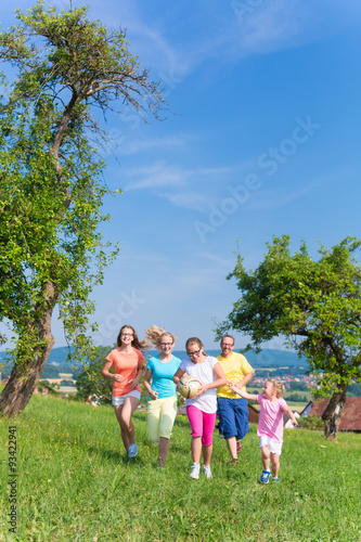 Fototapeta premium Father with children running on green meadow grass