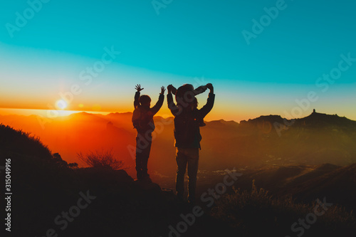 © nadezhda1906, Fototapeta premium father with kids travel in sunset mountains, happy family in nature