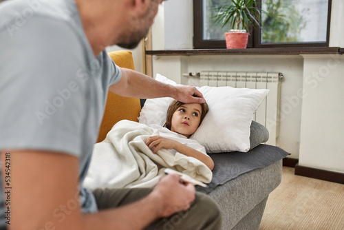 © Svitlana, Obraz premium Father with thermometer touch forehead of sick son