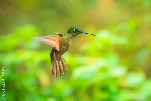 Fototapeta premium Fawn-breasted Brilliant Hummingbird in flight, 4K resolution, best Ecuador humminbirds