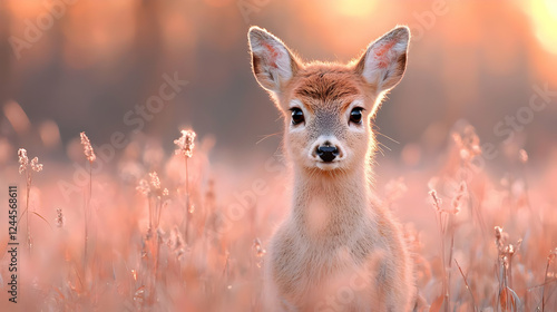 Fototapeta premium Fawn in sunset meadow, wildlife, nature