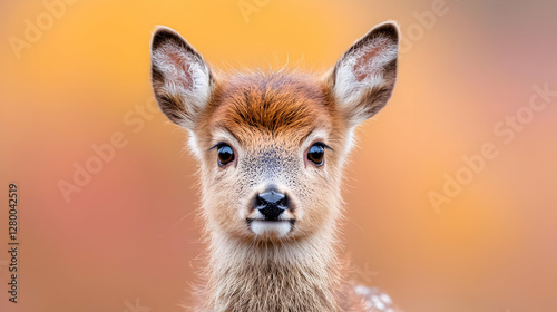 Fototapeta premium Fawn portrait, autumn forest, blurred background, wildlife photography