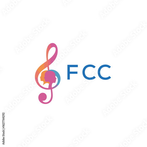 © MDENAMUL, Naklejka premium FCC “Creative music logo with human silhouettes and treble clef in gradient colors, FCC Later Logo, modern artistic design isolated on white background”