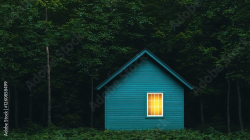 © Omias, Fototapeta premium Fear of the Dark Concept, Isolated House in Woods with Faint Glow from Window Surrounded by Dark Forest Trees at Dusk