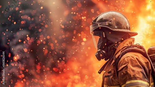 Fototapeta premium Fearless firefighter in protective gear and helmet standing amidst raging...