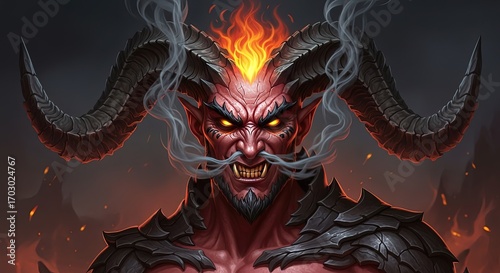 Naklejka premium Fearsome demon with glowing eyes and fiery horns breathes smoke, embodying...