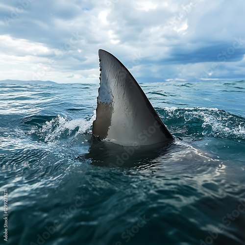 Fototapeta premium Fearsome shark fin slicing through ocean waves image