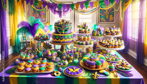 Fototapeta premium Feast of Festivity: Mardi Gras Dessert Table with Highlighted CupcakesFeast...