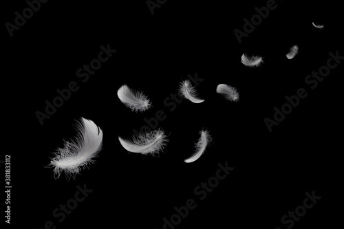 Obraz premium Feather abstract freedom concept. Soft light fluffy a white bird feathers floating in the air. Black background.