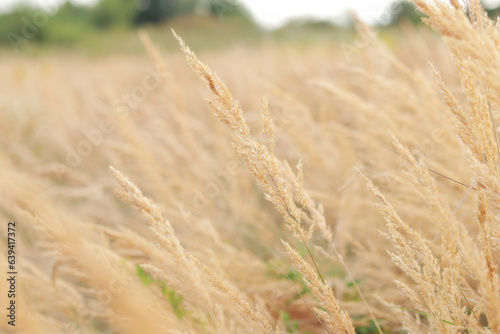 Fototapeta premium Feather Reed Grass sways slowly in the wind. Natural background, close-up. Wind sways wild grass, landscape. Selective focus