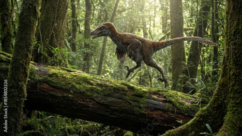 Obraz premium Feathered raptor dinosaur is running across a moss-covered fallen log in a dense, sunlit prehistoric jungle, depicting ancient wildlife and extinction concept