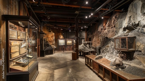 Fototapeta premium featuring artifacts and exhibits in a mining museum, with historical photographs and interactive displays, emphasizing the rich history of mining