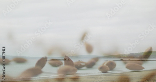 Naklejka premium Featuring blurred seed heads swaying at sandy beach, framing calm sea and distant headlands