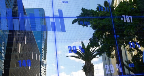 Naklejka premium Featuring palm tree standing beside broadleaf tree in financial district, skyscrapers, data overlay