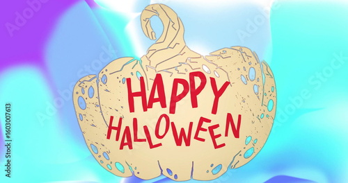 Fototapeta premium Featuring stylized beige pumpkin sitting center of purple cyan gradient, with red HAPPY HALLOWEEN