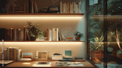 Fototapeta premium Featuring Warm Accent Lighting on Built-in Bookshelves Adorned, Plants, Decor...