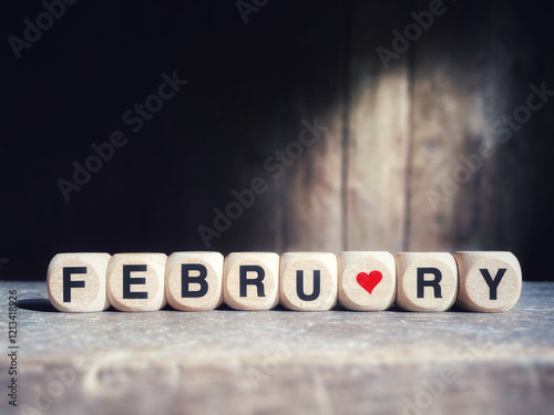 © Frederica Aban, Obraz premium February word on wooden cubes in retro style background. Stock photo.