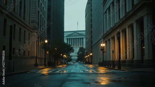 © Velem, Fototapeta premium Federal Reserve building on a quiet street during dusk. Featuring financial stability and economic growth