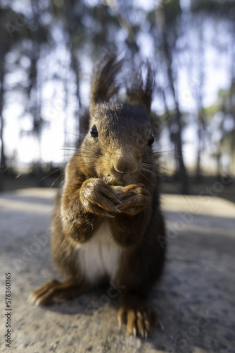© celiafoto, Fototapeta premium Feeding a squirrel in the woods