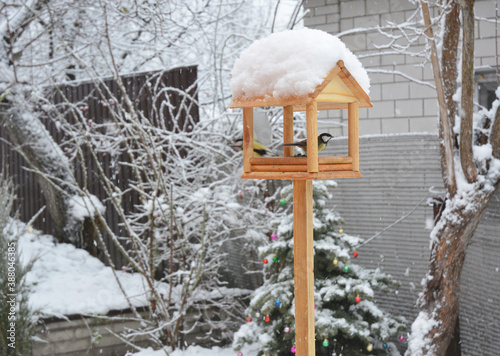 Naklejka premium Feeding blue tits with sunflower seeds from a wooden chalet style open sided wild bird platform feeder in the backyard of a house in snowy and frosty winter.