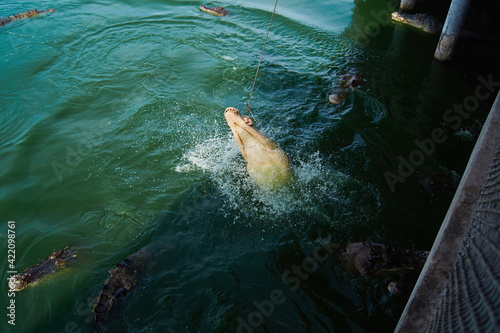 © Anastasiia, Obraz premium Feeding crocodiles from a fishing rod with raw meat at a crocodile farm in the river. Thailand