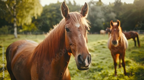 © Natawut, Fototapeta premium Feeding farm horses fresh grass