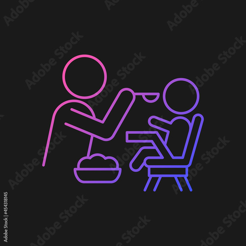 © IMG visuals icons, Fototapeta premium Feeding in highchair gradient vector icon for dark theme. Helping baby eating. Bonding with child during mealtime. Thin line color symbol. Modern style pictogram. Vector isolated outline drawing