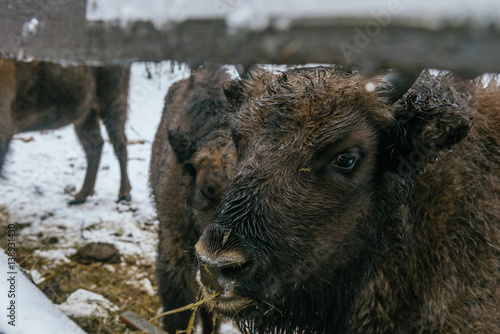 © artistique7, Obraz premium Feeding of European Bisons' Family in National Park