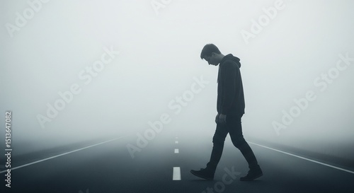 © Creative Concepts , Fototapeta premium Feeling Alone: Person Walking into Dense Mist, Symbolic Scene