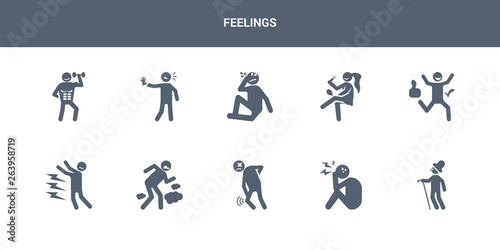 © CoolVectorStock, Naklejka premium 10 feelings vector icons such as optimistic human, overwhelmed human, pained human, pissed pissed off contains positive pretty proud pumped ready feelings icons
