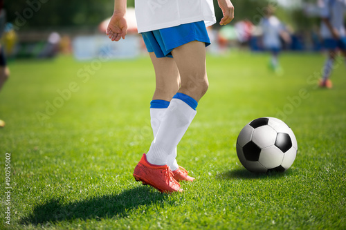 Fototapeta premium Feet of football player with soccer ball. Soccer players before kick pass to...
