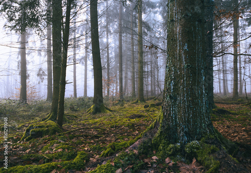 © Winfried, Obraz premium Feiner Hochnebel im Fichten Forst mit Moos