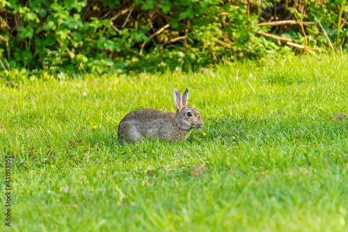© gottesfarben, Fototapeta premium Feldhase auf einer grünen Wiese mit Löwenzahn im Maul