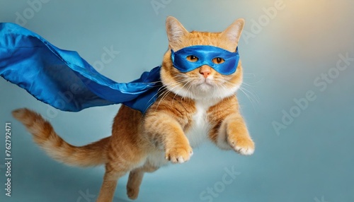 © Ashfaq, Fototapeta premium Feline Hero: Cute Orange Tabby Kitty Soaring in Blue Cloak and Mask on Light Blue Background