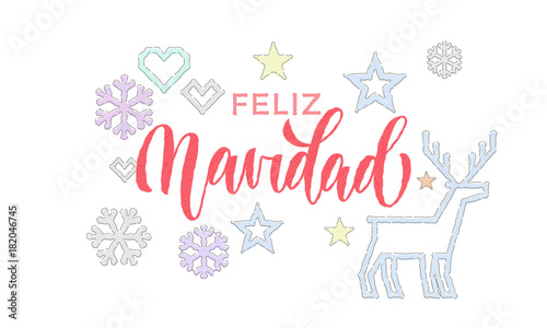 Fototapeta premium Feliz Navidad Spanish Merry Christmas knitted calligraphy font decoration for holiday greeting card design. Vector Christmas deer, snowflake decoration embroidery pattern on New Year white background
