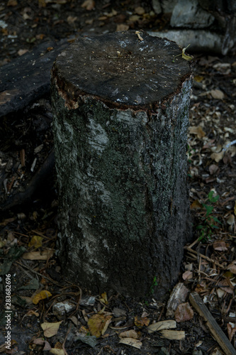 Obraz premium Felled birch stump stands on the ground in autumn leaves