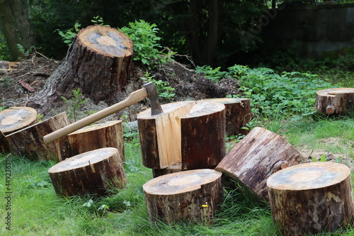 © Libor, Fototapeta premium Felled tree chopped up into logs. An ax stuck in a log. Inclined pine stump. Firewood.