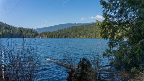 © Andrew, Naklejka premium felled tree trunk floating on forest lake in mountains