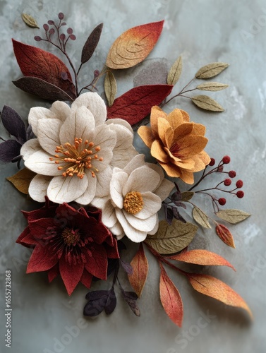 © Johannes, Fototapeta premium felt flowers and autumn leaves flat lay floral arrangement