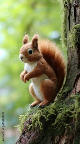 © Sabine, Fototapeta premium Felt Squirrel Perched on Tree in Greenery